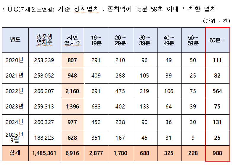 이와 관련해 <연도별, 열차 지연 횟수 현황> 자료를 살펴보니 25%의 금액을 배상해야 하는 40~60분 지연은 553건, 60분 이상 지연은 약 1,000건에 달하는 것으로 집계됐다.