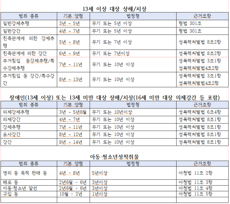 성폭력범죄가 대표적이다. 일반 강간죄의 법정형은 3년 이상 유기징역이지만, 양형위원회 기본양형은 2년 6월~5년으로 규정돼 있다. 친족관계에 의한 강간 역시 법정형은 7년 이상인데, 기본양형은 5~8년으로 낮게 설정돼 있다.