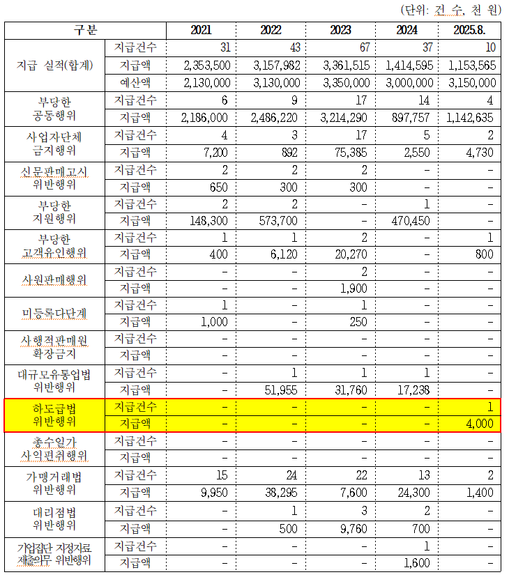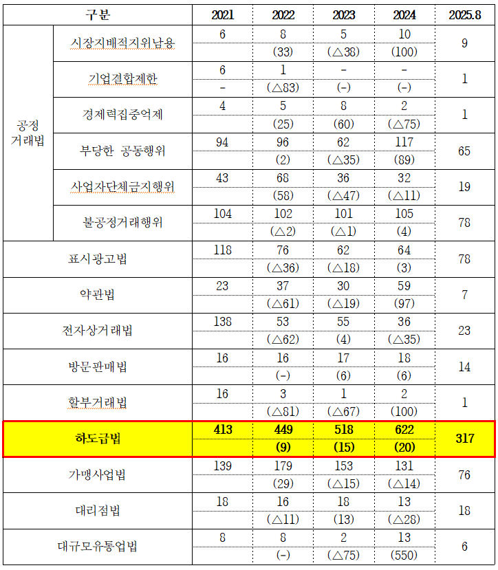 실제로 2025년 8월까지 접수된 하도급법 위반 행위 신고 건수는 317건에 이르며, 꾸준히 증가하는 추세를 보여 연말까지 신고 건수가 더욱 늘어날 것으로 전망된다.