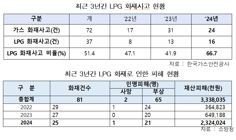 이 위원장에 따르면 전국 가스 화재에서 LPG 화재가 차지하는 비중은 해마다 높아지고 있다. 2023년 41.9%에서 2024년에는 66.7%로 급증했고, 같은 해 LPG 화재로 인한 재산피해액은 전년 대비 약 4배 증가한 23억 2천만 원에 달했다. 도시가스보다 사용 규모는 적지만 사고 비중은 압도적으로 높다.
