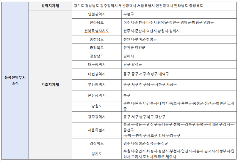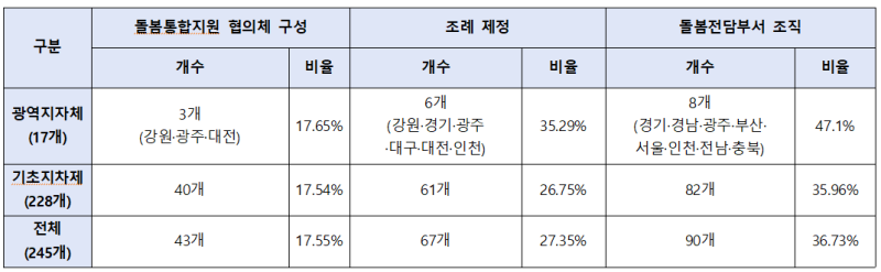 돌봄전담부서를 조직한 지자체는 광역 8개(경기·경남·광주·부산·서울·인천·전남·충북), 기초 82개로 전체 245개 중 90개(36.73%)이다. 협의체 구성이나 조례 제정보다는 비율이 높다.