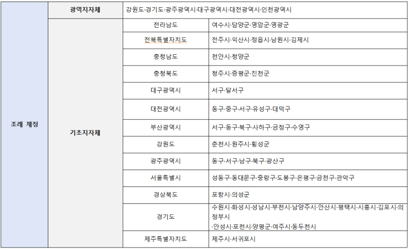 조례를 제정한 지자체는 광역 6개(강원·경기·광주·대구·대전·인천), 기초 61개로 전체 245개 중 67개(27.35%)으로 확인됐다.