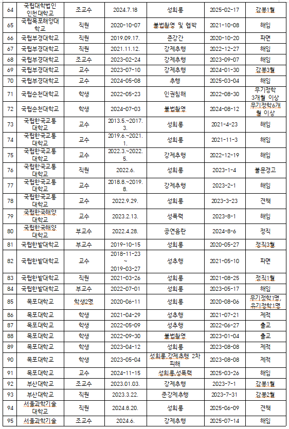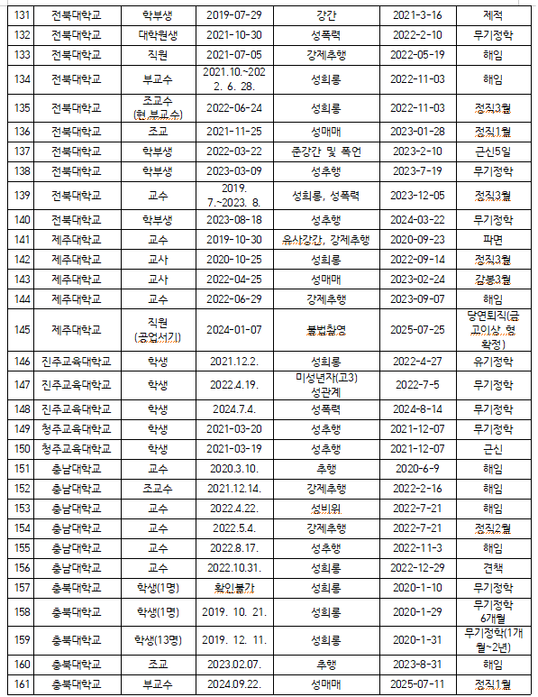 국회 교육위원회 소속 조국혁신당 강경숙 의원이 전국 39곳 국립대학교로부터 제출받은 자료에 따르면, 최근 5년간(2020~2025년 8월) 국립대학교 교직원과 학생의 성비위징계 건수는 161건으로 집계됐다.
