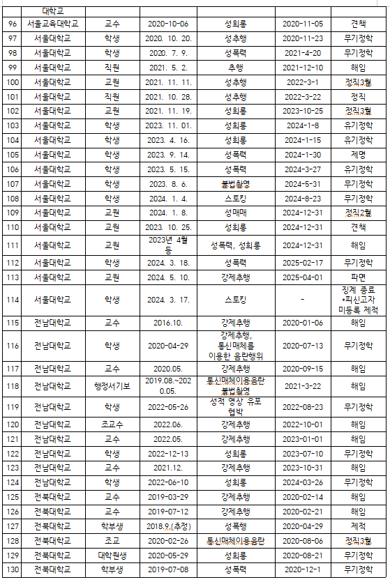 직급별로는 교수(정교수·부교수·조교수)가 68명, 학생이 67명으로 비슷한 수준이었다. 징계를 받은 교수 68명 가운데 9명은 감봉·견책 등 경징계에 그쳤으며, 25명은 정직·감봉 등 징계 이후 교단에 복귀했다. 즉, 한 학기가 끝나기도 전에 성비위로 징계를 받은 교수가 다시 교단에 서는 사례도 있다는 것이다.