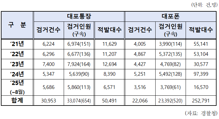 더불어민주당 한병도 의원(전북 익산시을, 국회 행정안전위원회)이 경찰청으로부터 제출받은 자료에 따르면, 최근 5년간 적발된 대포통장·대포폰 등 명의도용 물품은 총 30만 3,282건에 달했다. 이 기간 검거인원은 5만 6,466명, 이 중 1,174명은 구속됐다.
