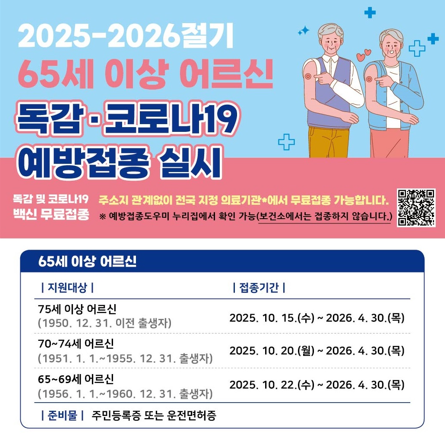 독감 및 코로나19 유행 대비 65세 이상 무료 예방접종 실시