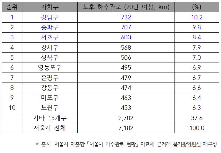 복기왕 국회의원(국토교통위원회)이 서울시로부터 제출받은 '하수관로 현황' 자료에 따르면, 20년 이상 노후 하수관로가 강남구 732km, 송파구 707km로 서울시 25개 자치구 중 1, 2위를 차지했다.