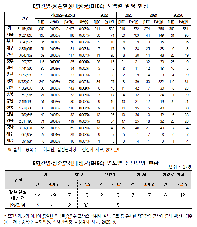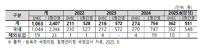 2022년부터 2025년 8월까지 2명 이상이 같은 음식물을 먹고 설사, 구토 등 유사한 감염 증상을 보인 집단발병 사례를 보면, 장출혈성대장균은 22건에 걸쳐 49명, 그리고 E형간염은 3건을 통해 41명이 감염된 것으로 나타났다.