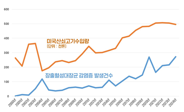 그도 그럴것이 2000년부터 2024년까지 미국산 쇠고기 수입량과 국내 장출혈성대장균 환자수가 비례해서 증가한 것으로 나타나 경각심을 일깨우고 있다.