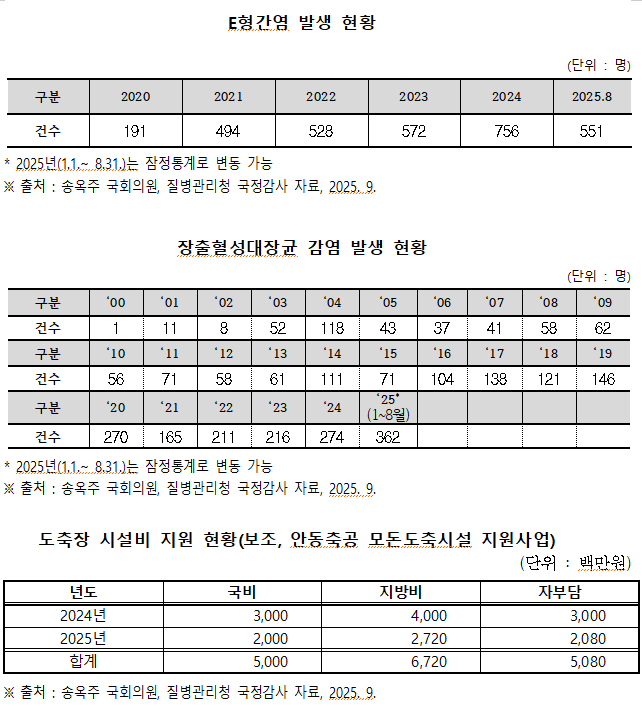 특히 감염경로를 따져 보면, 국내 뿐 아니라 해외유입 사례도 최근 증가하고 있다. 2023년부터 2025년 8월까지 외국에서 유입된 E형간염 바이러스와 장출혈성대장균 감염 사례는 각각 22건과 18건이다. 이에 따라 국내 축산물 위생 강화와 함께 수입 축산물 검사와 해외 입국자 관리 등에도 철저를 기해야 할 것으로 보인다.