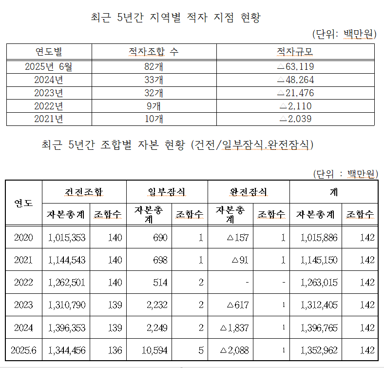 자본잠식 조합도 꾸준히 늘어 2021년 2곳(완전잠식 1, 일부잠식 1)에서 2024년 3곳(완전잠식 1, 일부잠식 2)으로 증가했다. 2024년 기준 완전잠식 조합은 광주광역시, 일부잠식 조합은 사천·울릉으로 확인됐다.