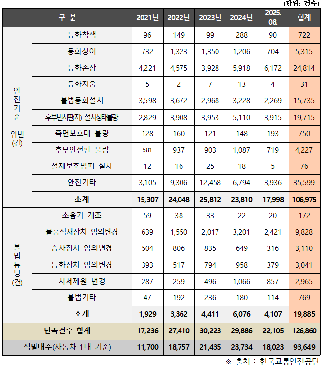 최근 5년간 불법 튜닝 및 안전기준 위반 총 12만 6천건 적발