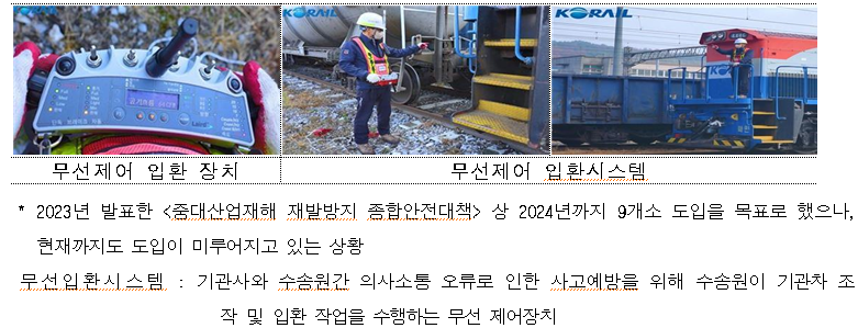 수립한 대책 상 2024년까지 무선 입환시스템 도입을 목표로 했으나 2024년 국정감사에서 지적을 받은 이후 1년여 지난 지금까지도 도입이 이루어지지 않고 있으며, 기선로전환기 개량, 조명 설비 확충, CCTV 설치 같은 필수적 안전조치들도 제때 이루어지지 않고 있는 상황이다.