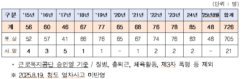 국회 국토교통위원회 소속 정점식 의원(국민의힘, 경남 통영‧고성)이 한국철도공사(코레일)로부터 제출받은 「연도별 공무 중 발생한 현장 직원 부상‧사망사고 현황」 자료에 따르면 최근 10년간(2016년~2025년 8월까지) 총 726건의 사고(사망 21명, 부상 705명)가 발생한 것으로 나타났다.