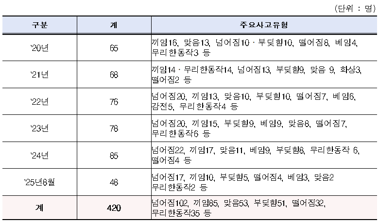 주로 넘어짐(102건), 끼임(85건), 맞음(53건), 부딪힘(51건)으로 인한 사고가 주요 요인으로 집계됐는데, 문제는 해마다 사고로 목숨을 잃는 사망사고가 끊이지 않고 있다는 것이다.