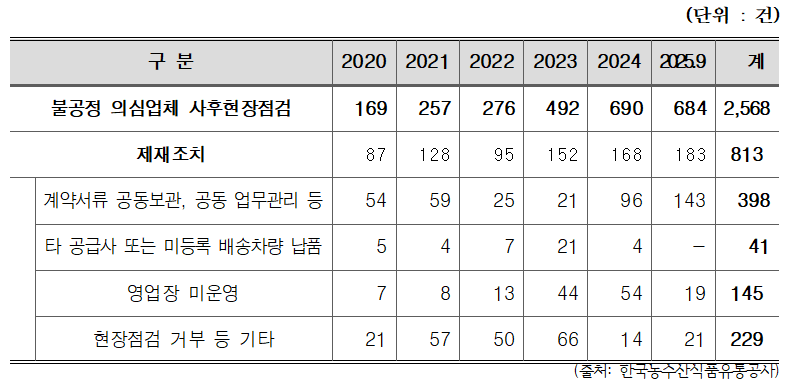 또한 ‘영업장 미운영’으로 적발된 업체도 145개소, ‘타 공급사 또는 미등록 배송차량 납품’사례도 41건으로 확인됐다. 일부 업체는 실제 영업장을 운영하지 않고 임의의 창고를 통해 납품하는 등, 관리 사각지대의 심각성이 드러났다.