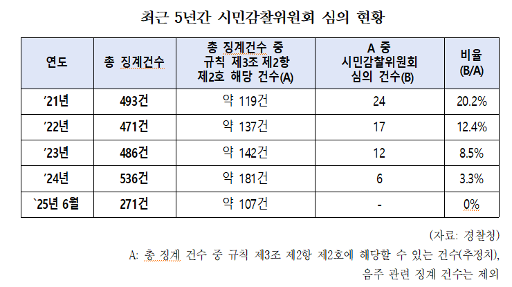 지난 몇 년간 경찰관 비위 사건이 증가함에 따라 시민감찰위원회 심의 대상 사건 수 또한 2021년 119건에서 2022년 137건, 2024년 142건, 2024년 181건으로 크게 늘었다. 이와는 반대로 실제 심의 건수는 2021년 24건, 2022년 17건, 2023년 12건, 2024년 6건으로 줄었고, 올해 6월까지는 약 107건의 대상 사건 중 단 한 건도 심의를 거치지 않았다.