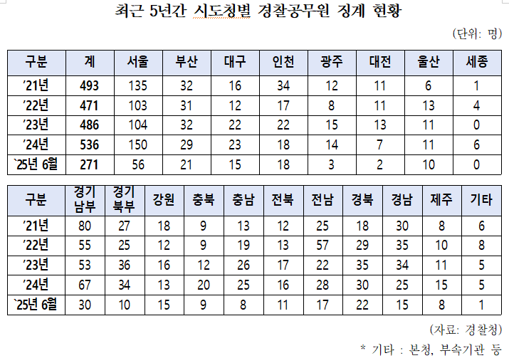 16일 더불어민주당 한병도 의원(전북 익산을)이 경찰청으로부터 제출받은 자료에 따르면, 지난 4년간 경찰공무원 징계 건수는 2021년 493건, 2022년 471건, 2023년 486건, 2024년 536건으로 2022년 이후 증가세를 보였다.