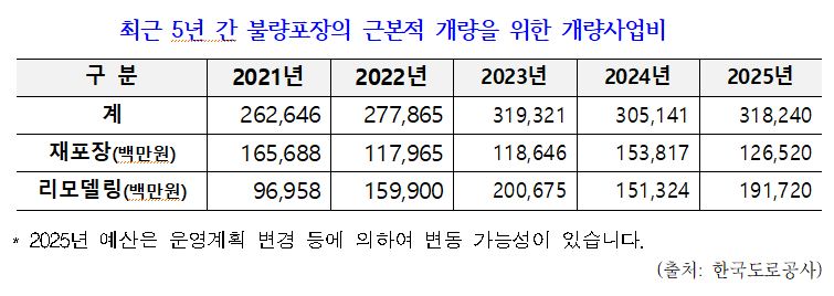 이와 함께 도로 재포장과 리모델링 등 포트홀 사전예방을 위한 개량사업비 규모는 2021년 2,626억 원에서 2025년 3,182억 원으로 확대됐다. 같은 기간 개량사업비 중 리모델링 공사비는 969억 원에서 1,917억 원으로 큰 폭으로 증가했다.