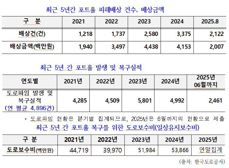 국회 국토교통위원회 소속 이건태 국회의원(경기 부천병, 더불어민주당)이 한국도로공사로부터 제출받은 자료에 따르면, 2021년부터 2025년 8월 기준, 포트홀로 인한 피해배상 건수는 총 1만 1,032건, 배상금액은 약 160억 원에 달하는 것으로 집계됐다.