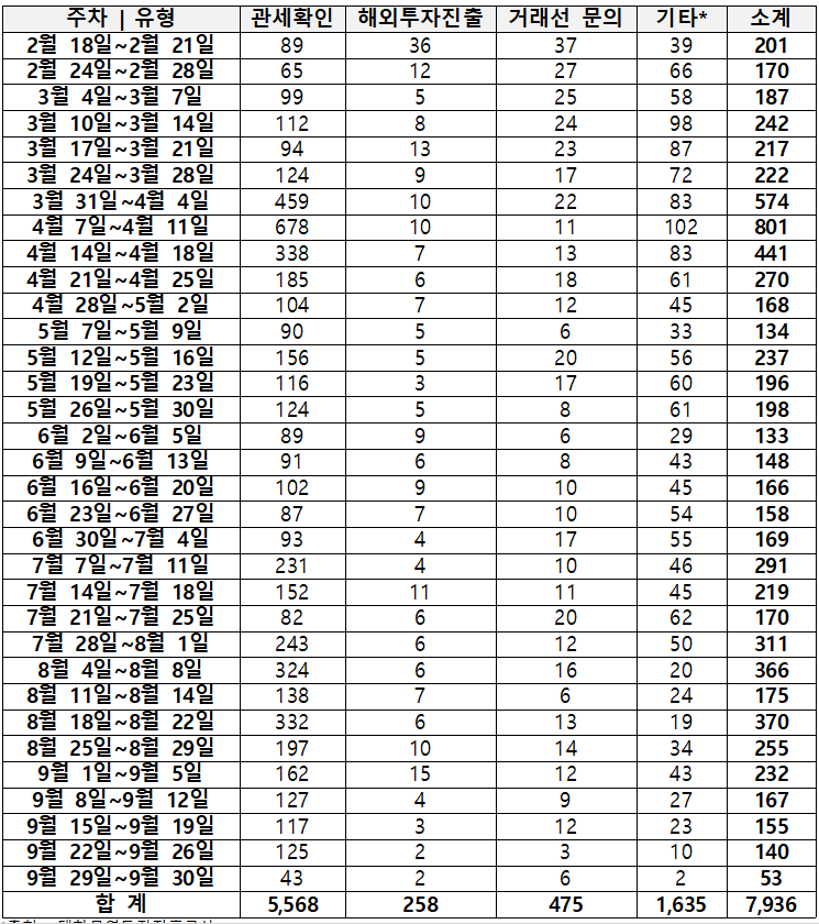 단 2주 만에 3.6배 늘어난 셈이다. 같은 기간 관세확인 문의도 주당 100건 안팎에서 △459건 △678건으로 급등했다.