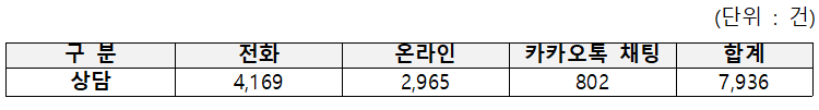 김원이 의원(산자위 간사, 목포시)이 코트라로부터 제출받은 “관세대응 119 종합상담실 운영 현황”에 따르면, 운영을 시작한 2월부터 9월까지 관세 정책 관련 애로상담은 총 7,936건에 달했다. 상담 접수 유형별로는 전화 상담이 4,169건, 온라인 상담이 2,965건, 카카오톡 채팅 상담이 802건으로 집계됐다.