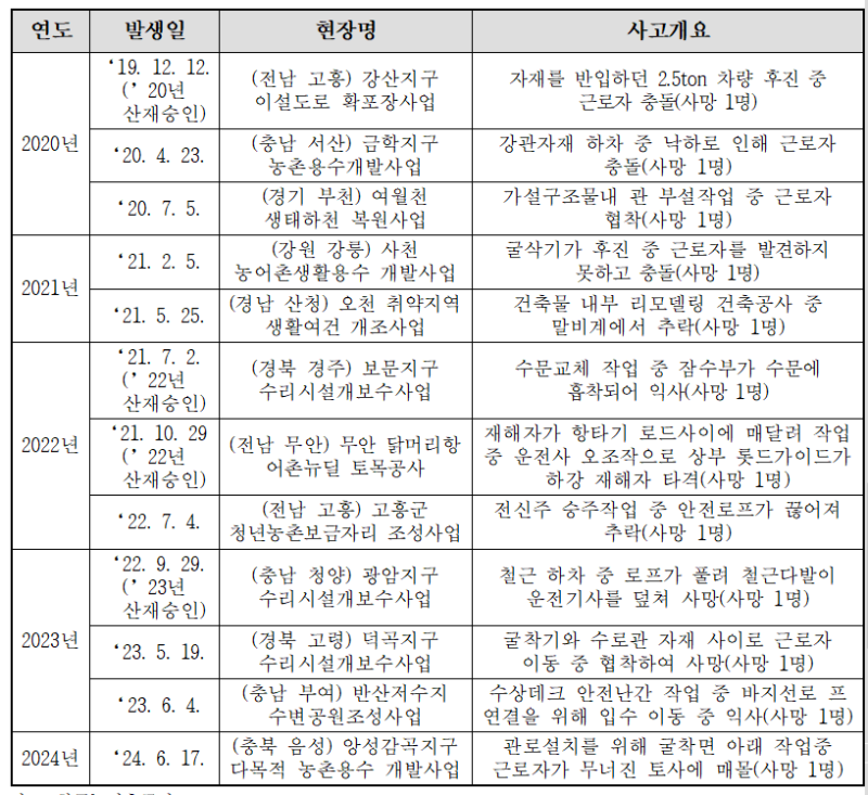 농어촌공사, 5년여간 안전사고 700건 발생, 사망자는 12명...전북 121건 충남, 경남, 경북, 전남 순