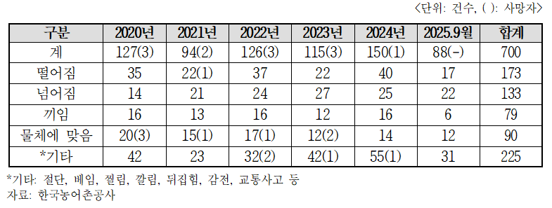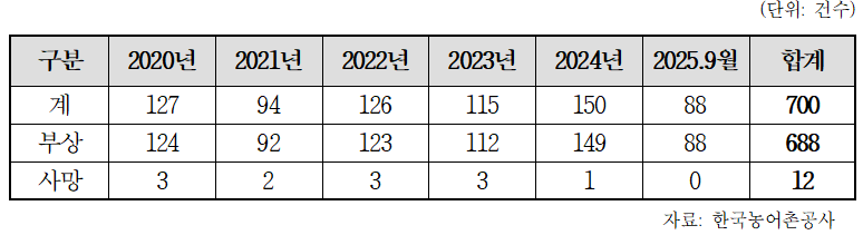 국회 농림축산식품해양수산위원회 김선교 의원(국민의힘, 경기 여주시‧양평군)이 한국농어촌공사로부터 제출받은 <최근 5년간(2020~2025.9월 기준) 안전사고 현황>을 분석한 결과, 2020년 127건에서, 2021년 94건, 2022년 126건, 2023년 115건, 2024년 150건, 2025년 9월 기준 88건 등 5년간 총 700건의 안전사고가 발생했다.