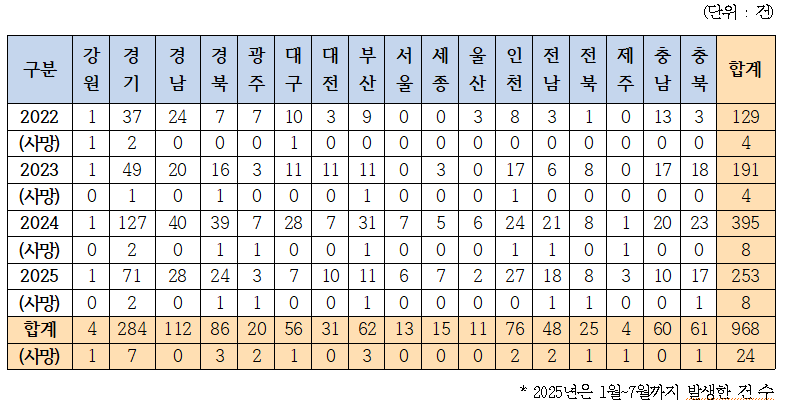 연도별 추이를 살펴보면, 2022년 129건(사망 4건), 2023년 191건(사망 4건)으로 증가했고, 2024년에는 395건(사망 8건)으로 급증했다. 2025년은 7월 기준 이미 253건(사망 8건)에 이르러, 해가 갈수록 산업재해와 사망사고도 늘어나는 추세다.