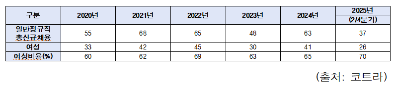 2020년~2025년(2/4분기) 정규직 여성 채용 현황
