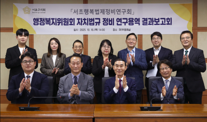 서초구의회(의장 고선재) 의원연구단체인 ‘서초구 재정·입법 정책 연구회’와 ‘서초행복법제정비연구회’가 잇달아 연구용역 결과보고회를 개최하며 자치입법 품질 개선을 목표로 연구를 활발히 이어가고 있다.