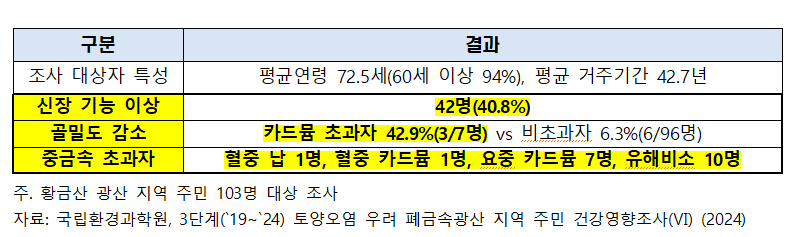 해당 지역 주민 103명 중 42명(40.8%)이 신장 기능 이상을 보였으며, 카드뮴 초과자의 골밀도 감소율은 정상인의 7배(42.9%)에 달했다. 환경단체와 강원도 주민들은 "부실한 조사와 책임 떠넘기기로 주민 피해가 심화된다"고 비판했다.