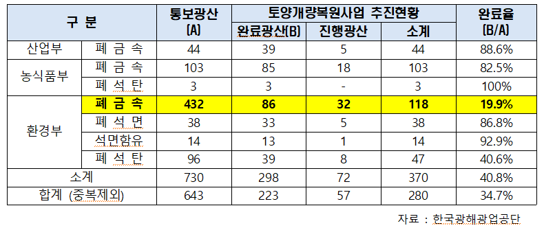 특히 환경부가 통보한 폐금속광산 복구율은 19.9%로, 산업부(88.6%) 및 농식품부(82.5%) 대비 현저히 낮아 부처 간 관리 격차가 뚜렷했다. 유해 중금속 오염과 직결된 폐금속광산이 부처 간 책임 공방 속에서 사각지대에 놓였음을 보여준다.