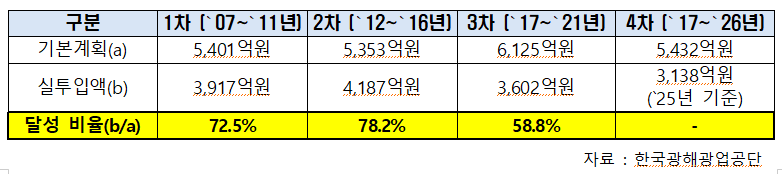 「광산피해방지법」에 따른 광해방지사업은 국가의 법정 책무이다. 그러나 공단이 올해 확보한 총수입 4조 1,589억 원 중 광해방지사업 투입 예산은 880억 원(2%)에 그쳤다. 공단은 2007년 이후 4차례 기본계획을 수립했으나, 평균 달성률은 60%대에 머물렀고, 최근 3차 계획(17~21)은 58.8%로 최저치를 기록했다.