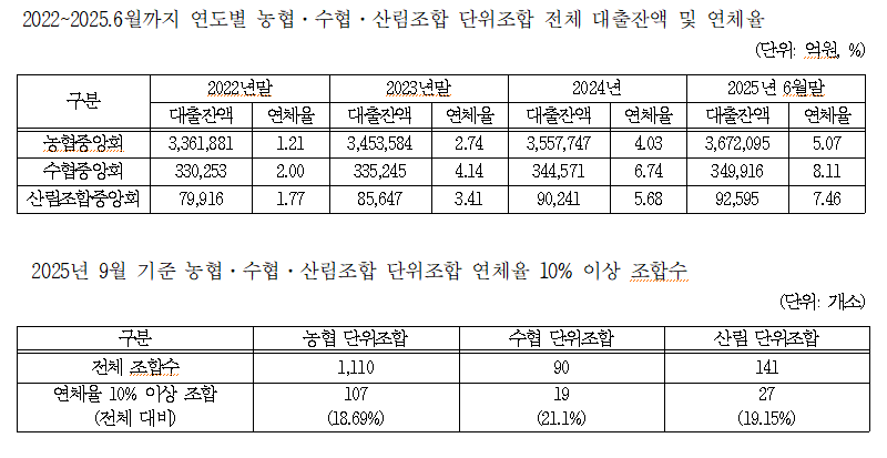 25년 6월 기준 연체율, 농협 5.07%·수협 8.11%·산림조합 7.46%...국내은행 평균 연체율(0.52%)의 15.6배 달해