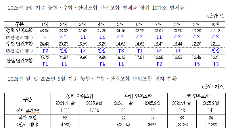 세부적으로 살펴보면, 각 조합별 최고 연체율은 24.48%~43.06%에 달했다. 농협 단위조합의 연체율 1위는 43.06%로 평균 연체율인 5.07%의 8.5배에 해당했다. 특히 해당 단위조합은 2024년 연체율이 36.39%로 가장 높았고, 올해의 경우에는 연체율이 무려 6.67%p나 늘어나 작년 국정감사에서 연체율 경감대책을 시행할 것을 주문하였음에도 효과가 없었음을 단적으로 보여줬다. 수협과 산림조합 단위조합 중 최고연체율은 각각 24.48%, 35.72%로 나타났다