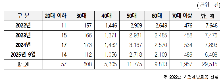 연간 연령대별 (20대이하, 30대, 40대, 50대, 60대, 70대 이상) 예방교육 이수 현황을 보면 50대 이상이 11,775명으로 가장 많고, 그 뒤를 이어 70대와 60대 순이었다. 한편, 20대 이하도 57명이나 되었다.