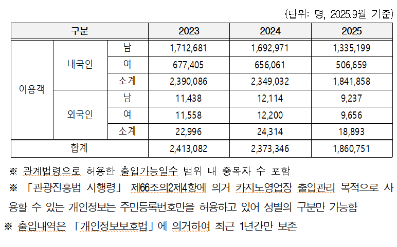 강원랜드 카지노는 내국인이 가는 유일한 카지노로 2024년 총 이용자 수 2,373,346명 중 외국인은 24,314명으로 1% 남짓으로 불과하다.