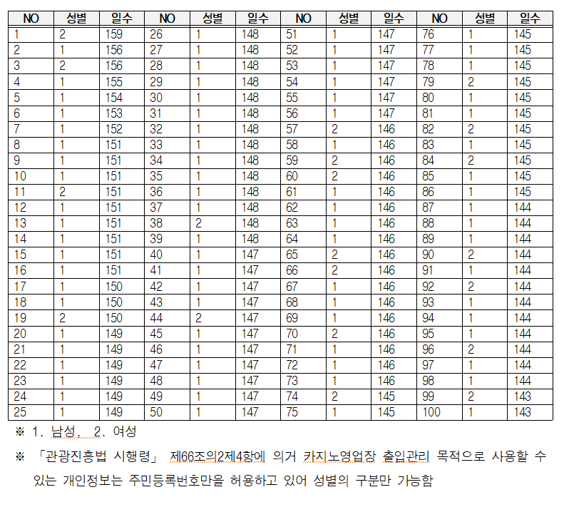 ‘최근 1년 이용객 상위 100명 (2024. 10. 15. ~ 2025. 10. 14.)’ 카지노 이용객 현황을 보면 100위를 차지한 고객은 143일로 1위 고객은 159일이다. 강원랜드가 매일 오전 10시~다음 날 오전 6시 영업하는 점을 고려하면 사실상 하루 종일 도박을 즐기고 폐장 시 잠시 쉬고 다시 카지오 영업장으로 가는 것으로 추정된다.