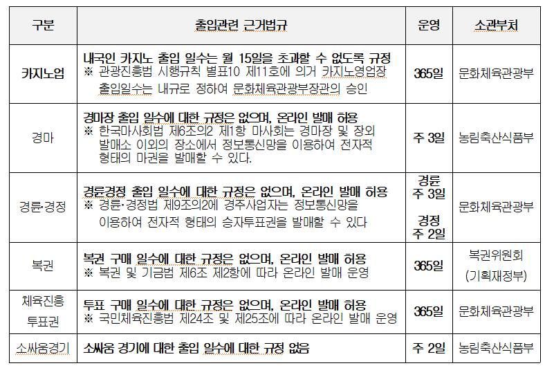 사행산업 업종별 운영일 수를 보면, 경마장과 경륜이 주 3일인데 반면 카지노는 365일 허용하고 있어 중독자들 양산의 우려가 제기되고 있다.