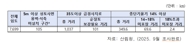 또한 35도 이상 급경사지 1,037km 중 101km(9.7%)는 산을 깎아 만든 비탈면임에도 보강이 제대로 이뤄지지 않아 추가 안정조치가 필요한 것으로 나타났고, 경사가 14% 이상 구간 349.6km 72km(20%)는 여전히 미포장 상태로 보강이 필요한 것으로 조사됐다.