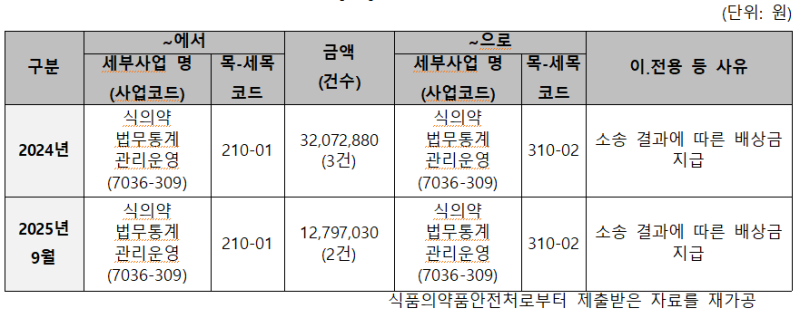 해당 기간 배상금 지급을 위해 총 5건의 예산 전용까지 이뤄졌다. 2024년 3건, 2025년 2건으로 약 4,487만원에 달한다.