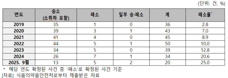 식약처 올해 4건 중 1건은 소송 패소...패소율 2019년 2.8%에서 올해 25%로 급증