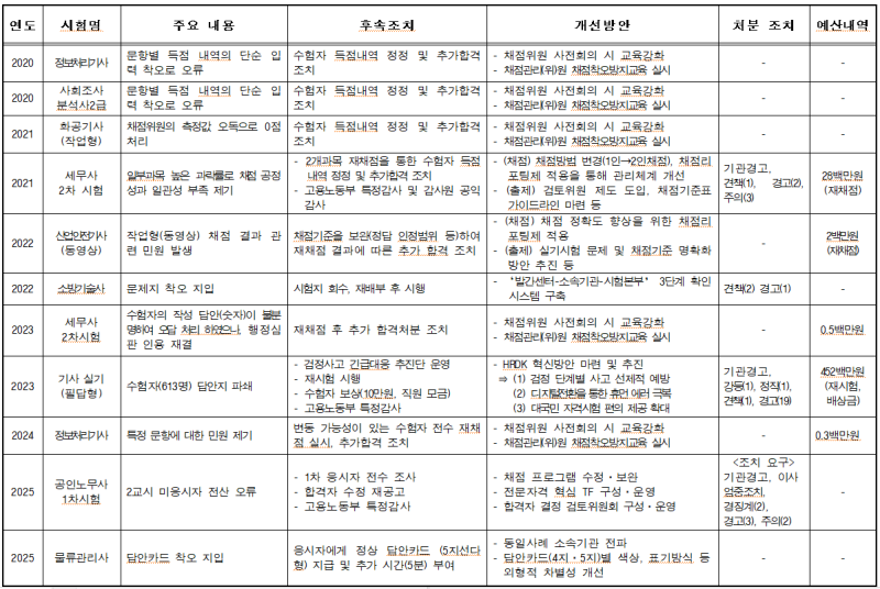 재채점 등에 추가 예산이 들어간 시험도 여럿 있었다.2023년 기사 시험에 응시한 613명의 답안지를 채점하지 않고 파쇄한 사고에서는 총 4억5천만 원의 배상금과 재시험 비용이 들었다.