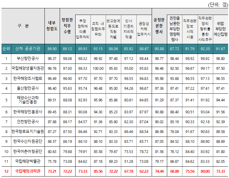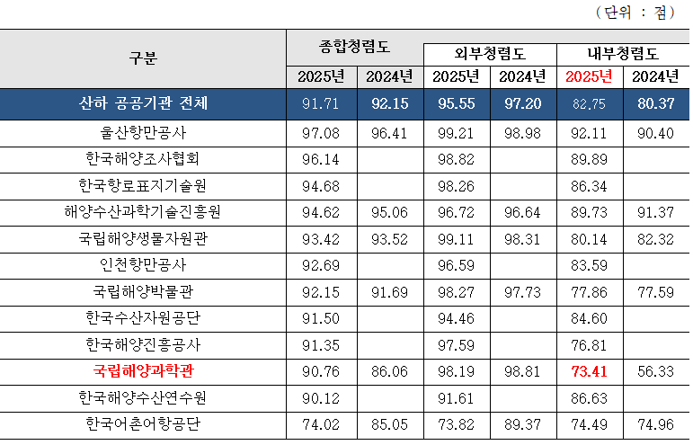 25년도 해양수산부 산하기관 청렴도 종합결과