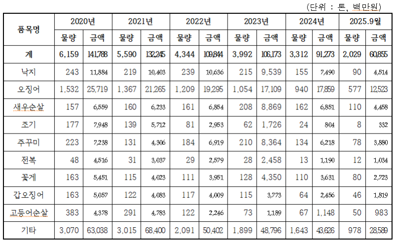 같은 기간 수협의 수산물 군납실적은 물량은 47%(6,159t → 3,312t), 납품액은 36%(1,418억 원 → 913억 원) 감소했다. 특히 조기 87%(177t → 24t), 고등어순살 83%(383t → 67t), 갑오징어 61%(163t → 64t) 등 주요 어종의 감소폭이 두드러졌다.