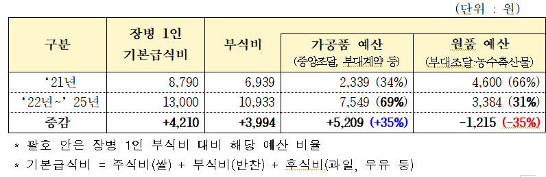 그러나 장병 1인당 기본급식비가 2022년 13,000원으로 책정된 이후 물가와 인건비가 지속 상승하면서, 국산 농수축산물 원재료 예산 비중은 2021년 66%(4,600원)에서 2024년 31%(3,384원)로 줄어든 반면, 즉석, 반조리 등 가공식품 비중은 같은 기간 34%(2,339원)에서 69%(7,549원)으로 늘어났다. 이는 국산 식재료의 절반 이상이 가공품으로 대체된 셈이다.