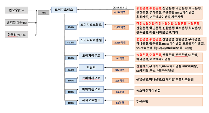 이원택 국회의원(민주당, 군산시김제시부안군을)이 금융감독원과 시중 여러 은행으로부터 제출받은 2025년 국정감사 자료를 분석한 결과, 도이치모터스 및 자회사들이 시중 은행들로부터 2024년 12월 31일자로 1조원이 넘는 대출을 받은 것으로 확인하였다.