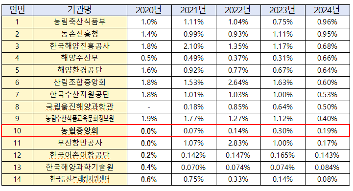 특히 농협중앙회의 경우, 중증장애인생산품 우선구매율이 2020년 0%에서 2024년에도 0.3%에 그쳤으며, 최근 5년간 단 한 차례도 법정 의무구매율(1%)을 달성하지 못한 것으로 확인됐다.
