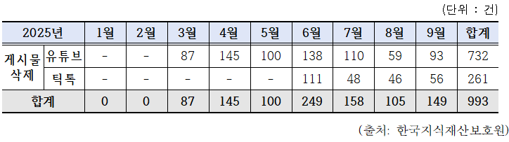 그 결과, 올해 9월까지 총 993건의 판매중지 조치가 이뤄졌으며, 이 중 유튜브가 732건으로 틱톡(261건)의 약 3배에 달했다.